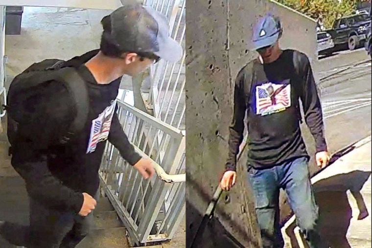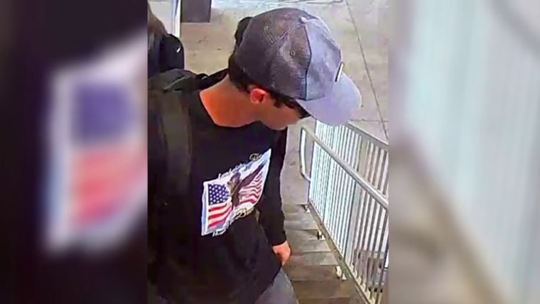 Further images released show what appears to be a young, thin man wearing a black long sleeved T-shirt with an American flag on it, black sunglasses, an Adidas hat, jeans and converse sneakers