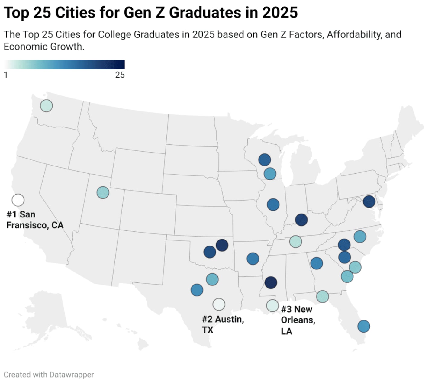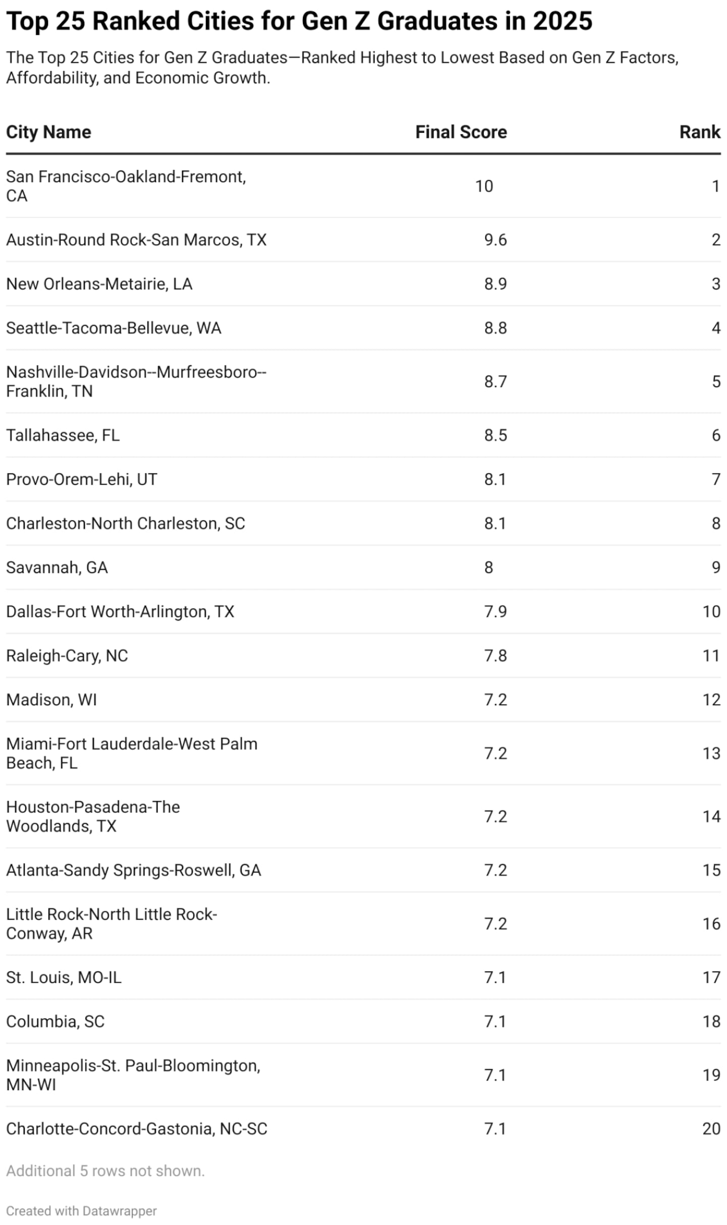 The San Francisco metro(including Oakland and Fremont) is the new grad capital of 2025. With the top Gen Z factor score of any U.S. metro, the City by the Bay boasts the No. 4 walk score and comes in No. 3 for entertainment and No. 2 for diversity. And it’s surprisingly not bad in affordability (ranking 13th) either.Southern states take 15 of the top 25 spots, including three cities in Texas and two each in North Carolina, South Carolina, Georgia, and Florida.With diversity, entertainment per capita, and walking score all within the top 10, San Francisco has the highest Gen Z score.For affordability, head to Des Moines, Iowa, where low costs and high(ish) salaries combine to make your best life more achievable — only seven U.S. cities offer lower rent.Grow faster in Austin, where incoming movers (No. 4), and new jobs (No. 3) create bigger opportunities to accelerate new careers.