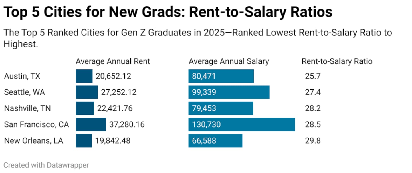 Speaking of affordability, after determining the top cities overall for new grads based on Gen Z factors, affordability, and economic growth, the rent-to-salary ratios for the top five were examined. While none matched Des Moines’ impressively low 19% ratio, each city on the list stays below the 30% threshold—while also offering a strong balance of affordability, entertainment options, and long-term growth potential.