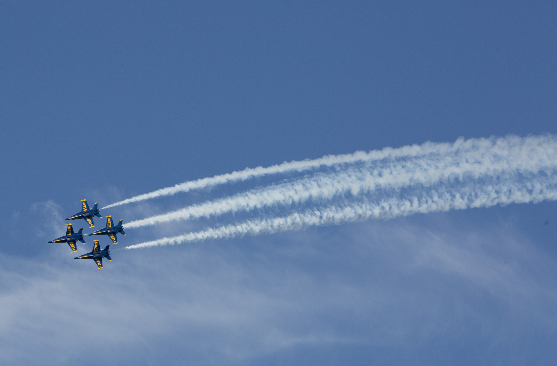 U.S. Navy Blue Angel jets fly over the San Francisco Bay. Blue Angels are the most popular event at the San Francisco Fleet Week air show. (Anne Wernikoff/KQED)