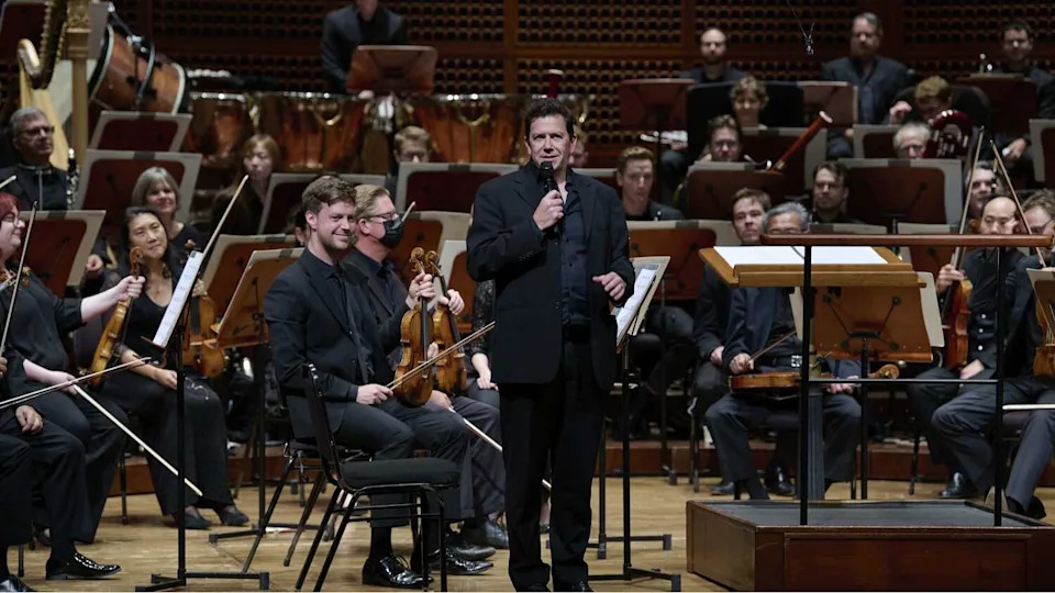 Composer and San Francisco Symphony first trombone Timothy Higgins introduces his “Market Street, 1920s” before its world premiere at Davies Symphony Hall on Friday, Oct. 3. (Stefan Cohen/San Francisco Symphony)