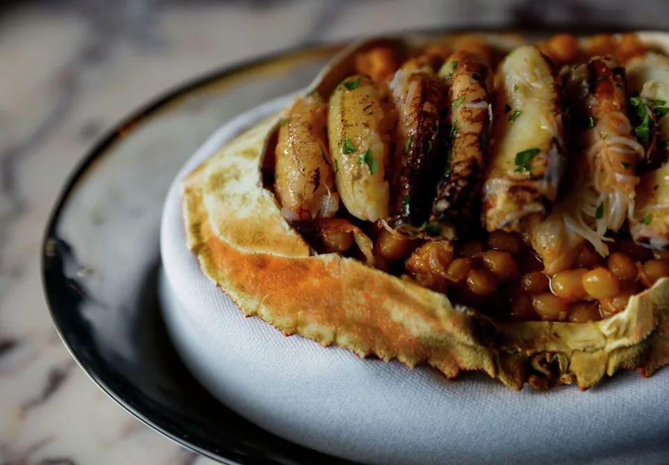 The whole Dungeness crab with fregola risotto, crab fat, uni butter and Meyer lemon-glazed crab legs at Bourbon Steak. (Yalonda M. James/S.F. Chronicle)