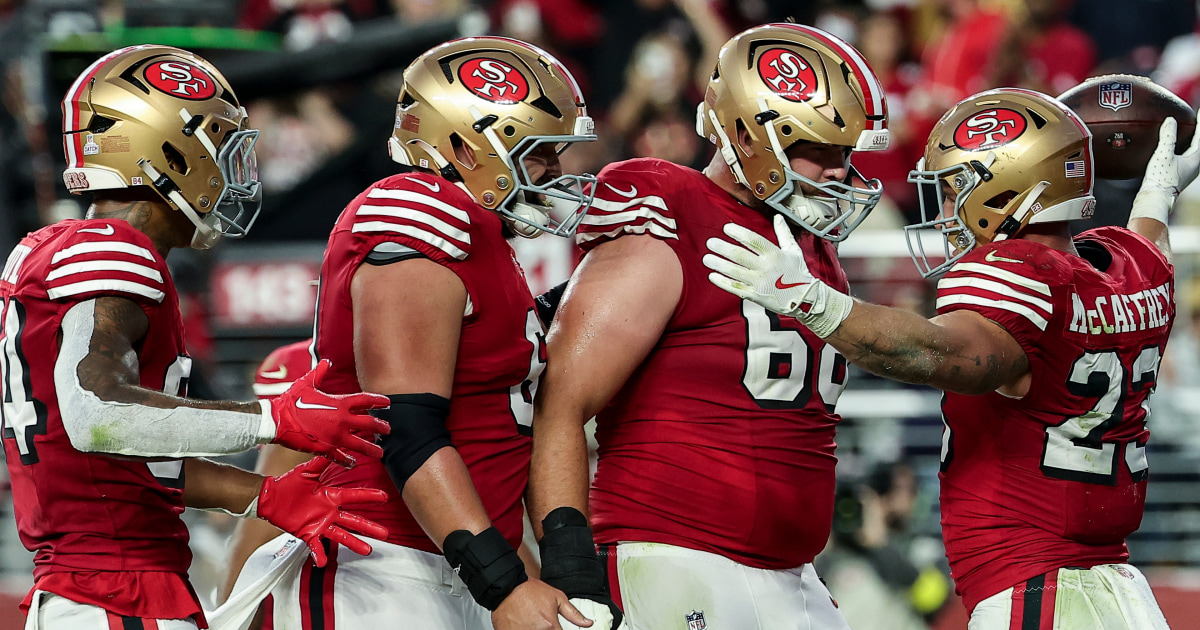 QB Brock Purdy (shoulder, missed four of six games)WR Brandon Aiyuk (knee, yet to play)WR Ricky Pearsall (knee, missed last two games)TE George Kittle (hamstring, missed five games)DL Nick Bosa (ACL, season-ending)