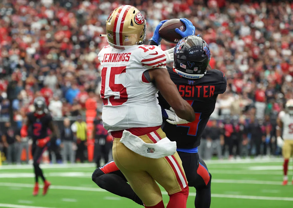Oct 26, 2025; Houston, Texas, USA; Houston Texans cornerback Kamari Lassiter (4) intercepts a pass intended for San Francisco 49ers wide receiver Jauan Jennings (15) during the fourth quarter at NRG Stadium. Mandatory Credit: Troy Taormina-Imagn Images